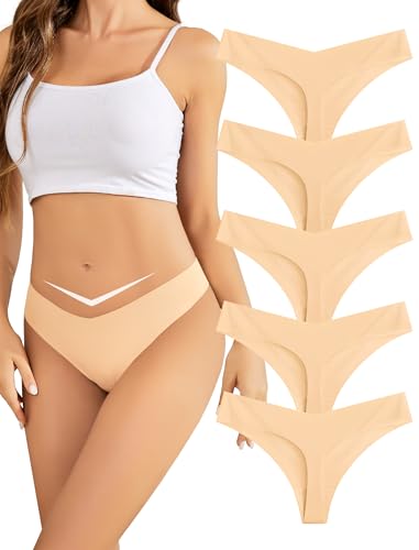 VOENXE Culotte Femme sans Coutures, Invisible String Tanga Taille Basse, Sexy Chic Slip Microfibre Shorty, sous-VêTements Seamless Thong Underwear Women Lot De 5, Nude, L