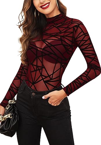 Avidlove Body Sexy Pour Femmes, Haut en maille élégant, T-Shirt Fit Y2K Casual Justaucorps Sexy Modelant Haut Top à Col Roulé Tenue De Festival Rave Bodys Hauts de soirée,Vin rougeL