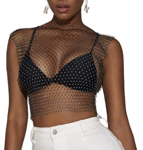 SamHeng Débardeurs à paillettes pour femmes, hauts courts noirs sexy en maille diamant ajourés, hauts courts transparents cloutés en strass pour tenue de festival club rave, dissimulant le clubwear