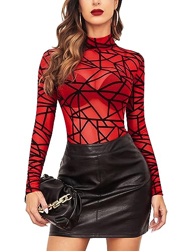 Avidlove Body Sexy Pour Femmes, Haut en maille élégant, T-Shirt Fit Y2K Casual Justaucorps Sexy Modelant Haut Top à Col Roulé Tenue De Festival Rave Bodys Hauts de soirée,RougeXL