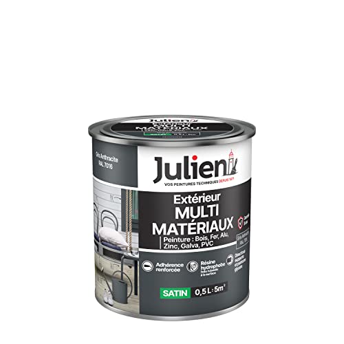 Julien Peinture Multi-Matériaux Satin en phase Aqueuse - Bois, Fer, Alu, PVC, Zinc, Acier galvanisé, brut ou peint - Gris Anthracite 0,5 L
