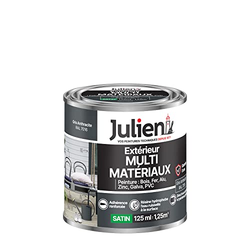 Julien Peinture Multi-Matériaux Satin en phase Aqueuse - Bois, Fer, Alu, PVC, Zinc, Acier galvanisé, brut ou peint - Gris Anthracite 0,125 L