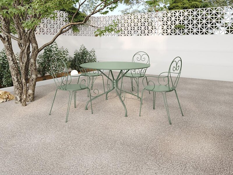 Mylia GUERMANTES Salle à manger de jardin en métal façon fer forgé : une table D.120cm et 4 chaises empilables Vert amande