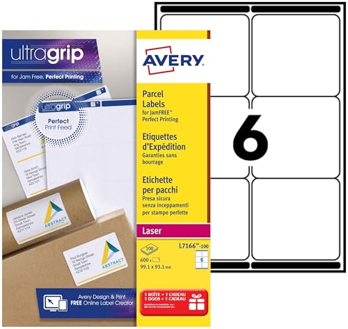 Avery Étiquettes Autocollantes Blanches, 600 Pièces, L7166-100, 99,1 x 93,1 mm, Papier A4, Feuille A4, Pour Imprimantes Laser, Anti-Bourrage, FSC Certifiées, Pour adressage et expédition