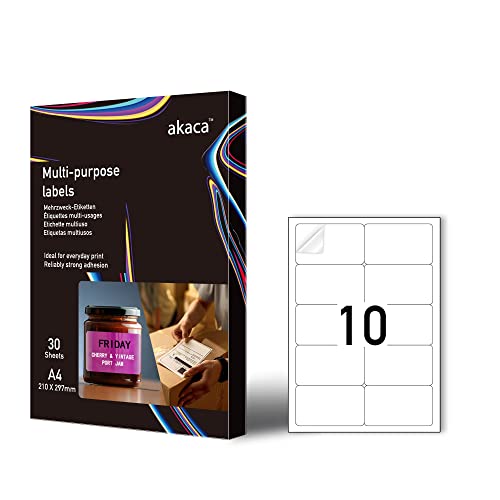 akaca Étiquette Autocollante Mate Blanche A4, 95 x 56 mm, 30 Feuilles, Papier Adhésif Imprimable pour Imprimantes Laser & Jet d'encre, 10 Étiquettes par Feuille