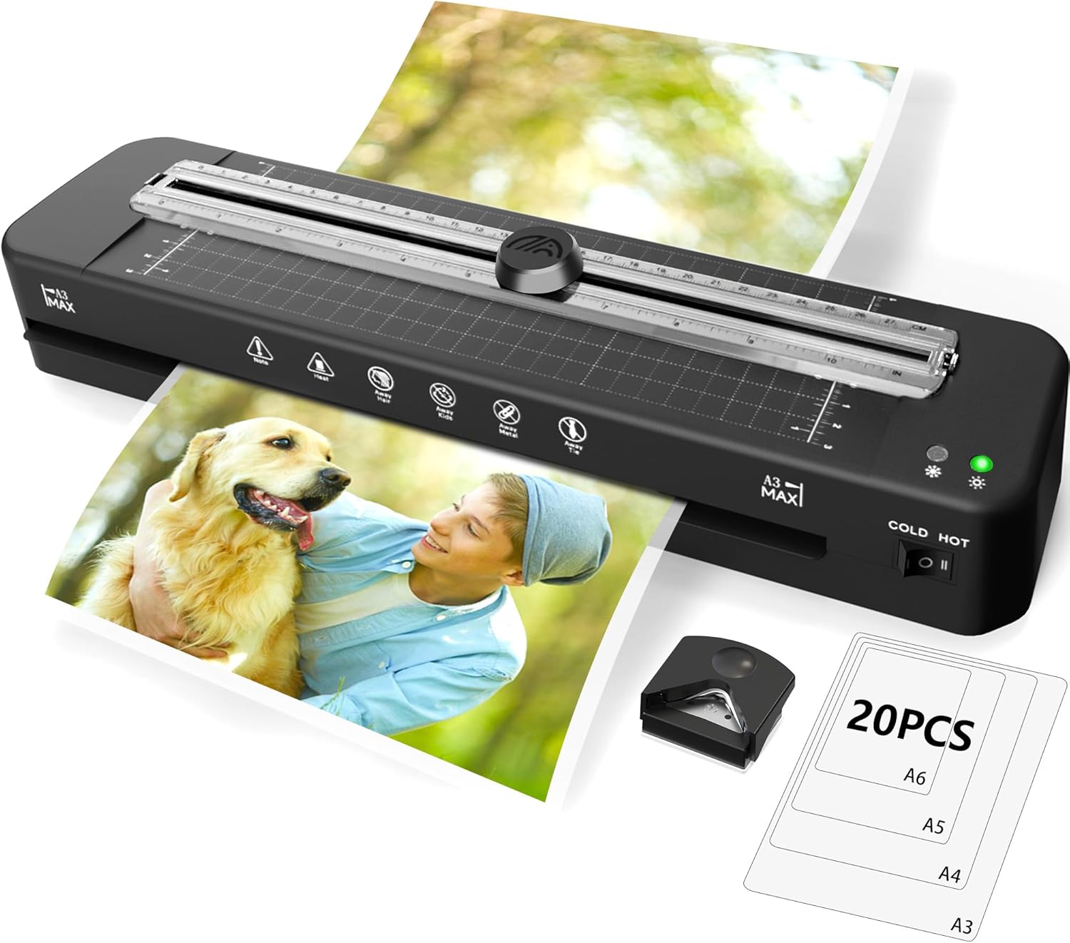 JEXNOVASHOP-Plastifieuse A3 A4 A5 A6 Plus de Tracas, Tout en Un Mode Chaud/Froid avec 30 Feuilles, Plastifieuse Multi Format avec Massicot, Perforatrice, Arrondisseur, Anneau pour Famille École Burea