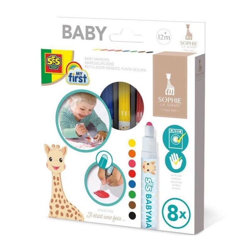 SES Creative | Sophie la Girafe Feutres Bébé Lavables | Kit 8 Crayons de Couleur Enfant | Pointe Sécurisée et Bouchon Anti-Étouffement | Matériel Créatif Bébé Sans Taches | Idée Cadeau Dès 1 An