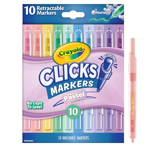 CRAYOLA Cliks – 10 Feutres Lavables Rétractables sans Capuchon, Couleurs Pastel Assorties, Pointe Conique 2 en 1, pour École Maison et Voyage, Enfants et Adultes