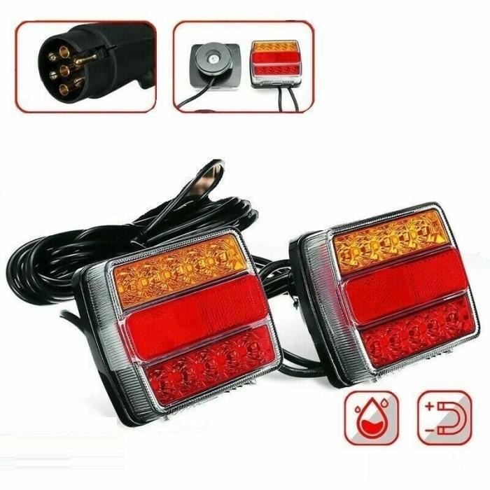 2 x Feux Arrière LED 5 Fonctions Base Aimanté Cable 75m Prise 7 Broches Pour Remorque Caravane Agricoles Camion Homologué E4