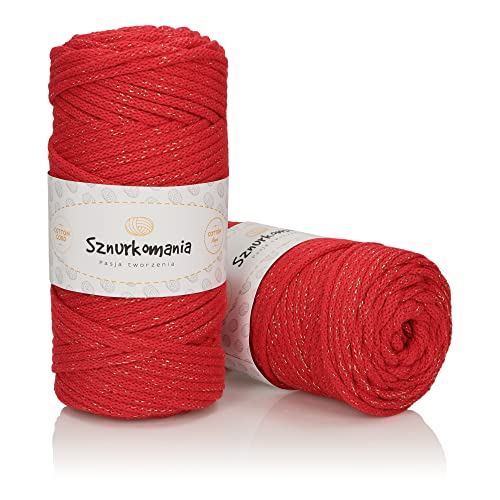 Cordon en coton pailleté 5 mm 100 m, cordon tressé avec fil métallique, cordon à crochet, cordon brillant, corde pour macramé, fil pour macramé (rouge avec fil doré)