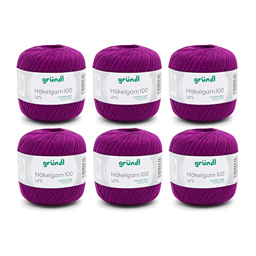 Gründl Laine Häkelgarn 100 – laine fine estivale pour le crochet – brillante et lavable – fil de coton – 100% coton – 6 pelotes 100 g / 566 m – taille d’aiguille 1,5 – 2 - Pourpre