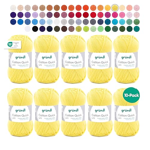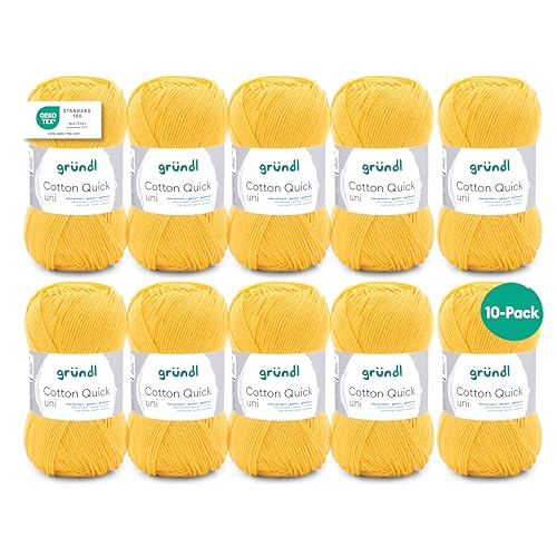 Gründl Laine Cotton Quick uni – laine fine pour crochet – fil à tricoter – fil à crocheter – brillante et douce pour la peau – 100% coton – 10 pelotes 50 g / 125 m – taille d’aiguille 3-4 –mais jaune
