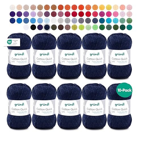 Gründl Laine Cotton Quick uni – laine fine pour crochet – fil à tricoter – fil à crocheter – brillante et douce pour la peau – 100% coton – 10 pelotes 50 g / 125 m – taille d’aiguille 3-4 –bleu foncé