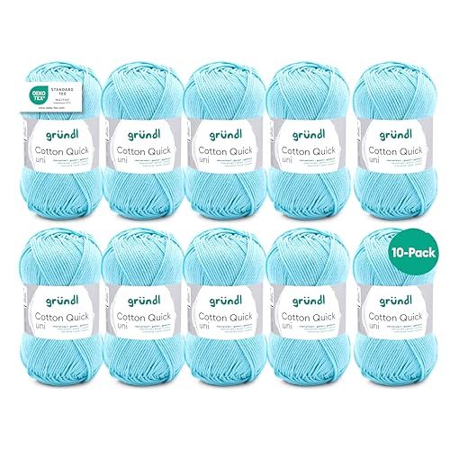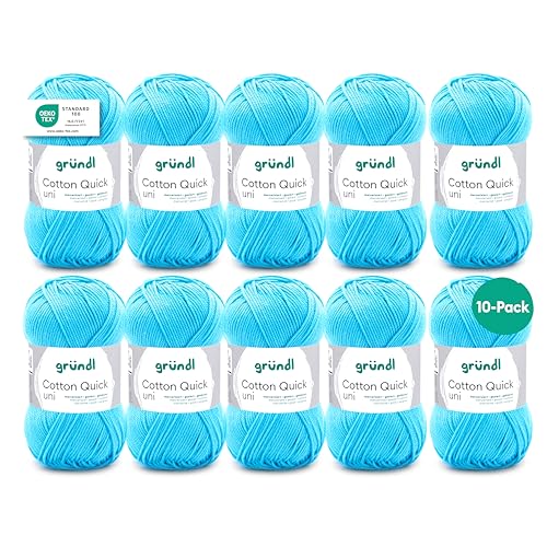 Gründl Laine Cotton Quick uni – laine fine pour crochet – fil à tricoter – fil à crocheter – brillante et douce pour la peau – 100% coton – 10 pelotes 50 g / 125 m – taille d’aiguille 3-4 –bleu d'eau