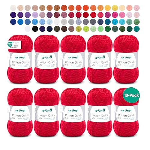 Gründl Laine Cotton Quick uni – laine fine pour crochet – fil à tricoter – fil à crocheter – brillante et douce pour la peau – 100% coton – 10 pelotes 50 g / 125 m – taille d’aiguille 3-4 –Red