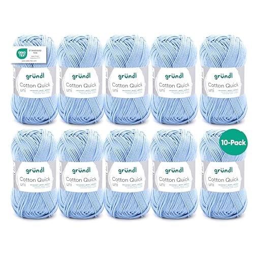 Gründl Laine Cotton Quick uni – laine fine pour crochet – fil à tricoter – fil à crocheter – brillante et douce pour la peau – 100% coton – 10 pelotes 50 g / 125 m – taille d’aiguille 3-4 –Bleu ciel