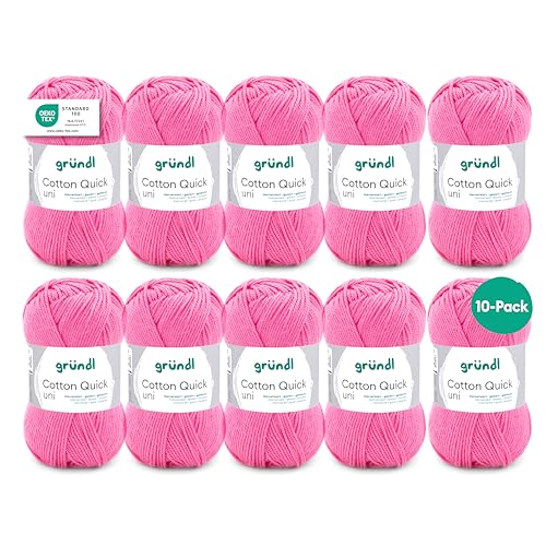 Gründl Laine Cotton Quick uni – laine fine pour crochet – fil à tricoter – fil à crocheter – brillante et douce pour la peau – 100% coton – 10 pelotes 50 g / 125 m – taille d’aiguille 3-4 –Pink