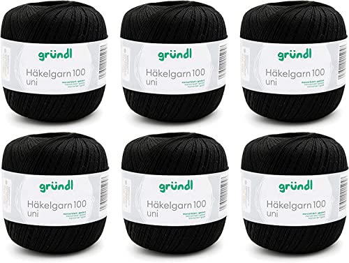 Gründl Laine Häkelgarn 100 – laine fine estivale pour le crochet – brillante et lavable – fil de coton – 100% coton – 6 pelotes 100 g / 566 m – taille d’aiguille 1,5 – 2 - Noir