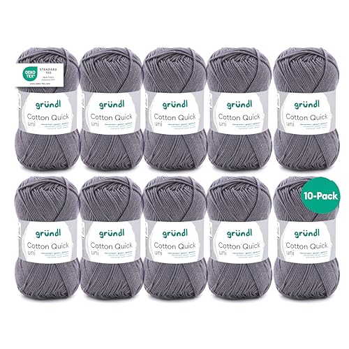 Gründl Laine Cotton Quick uni – laine fine pour crochet – fil à tricoter – fil à crocheter – brillante et douce pour la peau – 100% coton – 10 pelotes 50 g / 125 m – taille d’aiguille 3-4 –Grigio