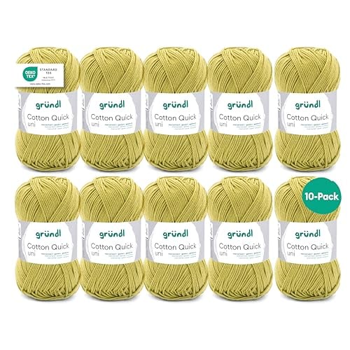 Gründl Laine Cotton Quick uni – laine fine pour crochet – fil à tricoter – fil à crocheter – brillante et douce pour la peau – 100% coton – 10 pelotes 50 g / 125 m – taille d’aiguille 3-4 –Senape