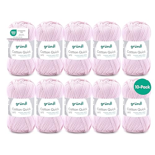 Gründl Laine Cotton Quick uni – laine fine pour crochet – fil à tricoter – fil à crocheter – brillante et douce pour la peau – 100% coton – 10 pelotes 50 g / 125 m – taille d’aiguille 3-4 –rose clair