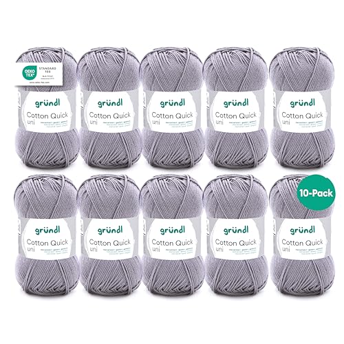 Gründl Laine Cotton Quick uni – laine fine pour crochet – fil à tricoter – fil à crocheter – brillante et douce pour la peau – 100% coton – 10 pelotes 50 g / 125 m – taille d’aiguille 3-4 –gris clair
