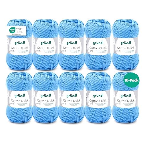 Gründl Laine Cotton Quick uni – laine fine pour crochet – fil à tricoter – fil à crocheter – brillante et douce pour la peau – 100% coton – 10 pelotes 50 g / 125 m – taille d’aiguille 3-4 –Azul claro