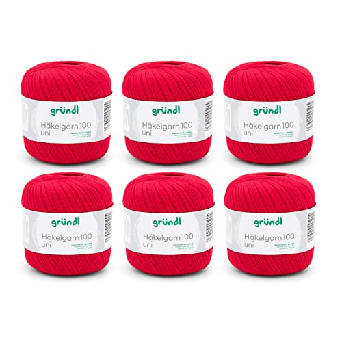 Gründl Laine Häkelgarn 100 – laine fine estivale pour le crochet – brillante et lavable – fil de coton – 100% coton – 6 pelotes 100 g / 566 m – taille d’aiguille 1,5 – 2 - Rouge