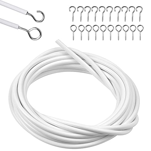 10m Blanc Cable Rideaux, Fil de Rideau Corde Suspendue, Câbles de Rideau avec 20 Paires Crochets et Yeux œillets pour Tringles à Rideaux et Suspension de Photos