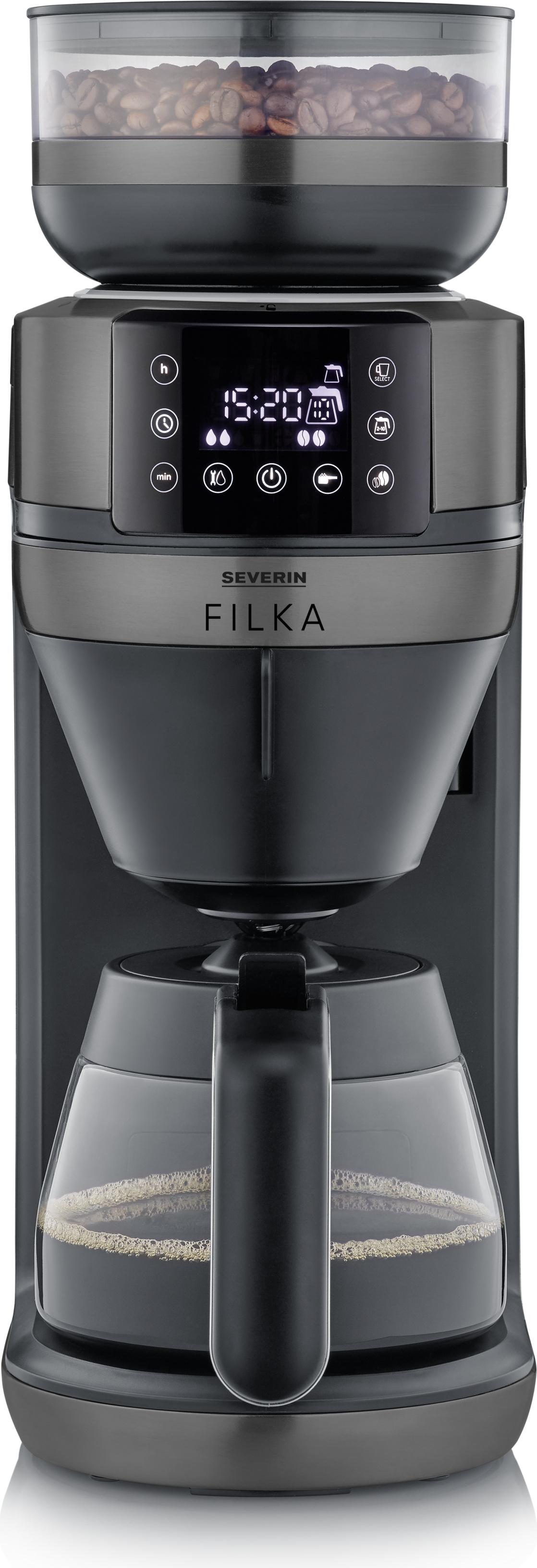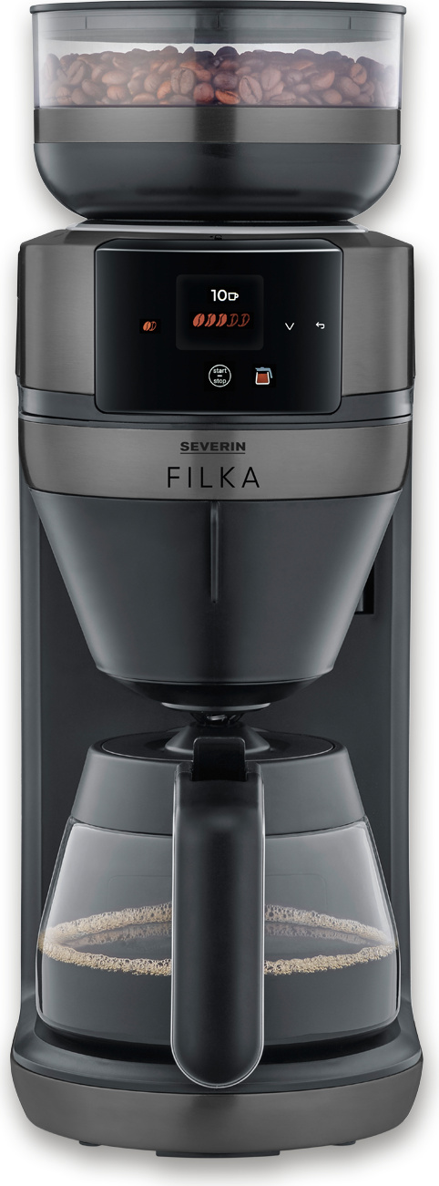 Severin Cafetière filtre automatique FILKA verseuse en verre, Cafetiere avec broyeur, Adapte la quantité d'eau à votre envie : mug, tasse, verseuse, KA 9694, Inox/Noir