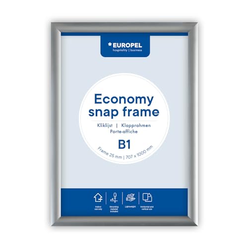 Europel Cadre clipsable Economy, A1, couleur argent, Profil 25x11mm, pour affiche de 59,4x84,1 cm, en aluminium anodisé, film anti-reflet, affichage de publicités, hôtel, bureau, restaurant, menus