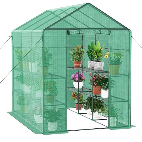 Ribelli Serre en film plastique avec porte enroulable, serre à tomates 143 x 195 x 213 cm, 4 étagères, résistante à l'hiver, film grillagé en polyéthylène, abri de jardin pour plantes, légumes, fleurs