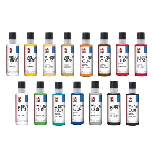 Marabu Window Color Fun & Fancy, Set de 15 x 80 ML, Peinture pour fenêtres à Base d'eau, s'enlève sur Les Surfaces Lisses comme Le Verre, Les miroirs, Les Carreaux et Le Film Plastique, Multicolor