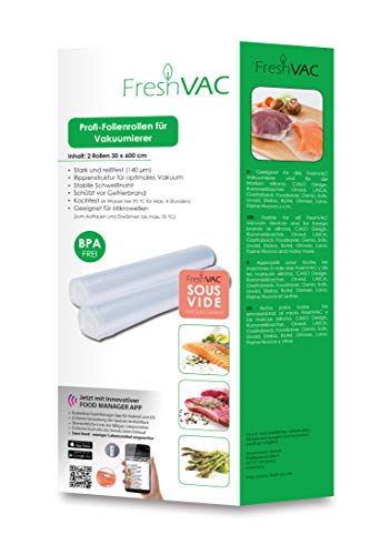 FreshVac Lot de 2 rouleaux de film plastique 20 x 600 cm pour mettre sous vide Forte et indéchirable 140 microns sans BPA Idéal pour SousVide Garen