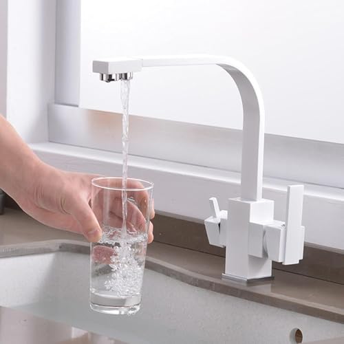 Robinet D’évier De Cuisine 3 en 1 Filtre à Eau Potable Robinet De Cuisine Robinet De Cuisine Pivotant à 360 ° à Trois Voies avec 2 Leviers, White