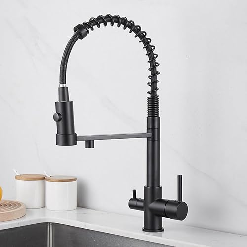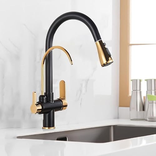 MOCHAMIK Robinet de Cuisine 3 Voies avec Filtre à Eau, Robinet de Cuisine avec douchette extractible, 2 poignées, Robinet de Cuisine en Laiton, mitigeur 1 Trou pivotant chromé, Noir