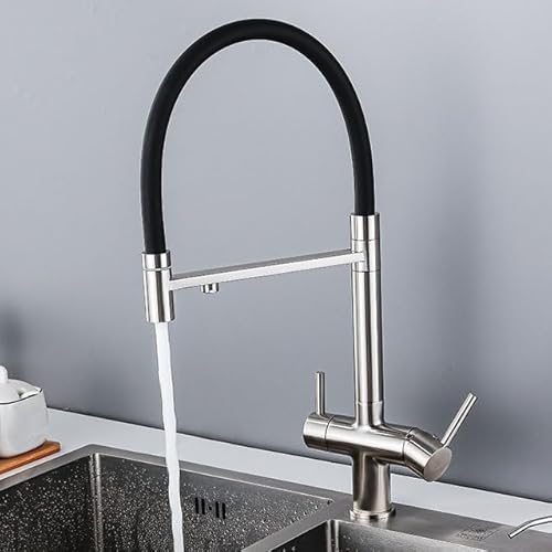 ISCBAFYX Mitigeur de Cuisine 3 Voies avec Filtre à Eau Potable, Robinet de Cuisine en Acier Inoxydable, 1 Trou, Double Levier, 2 Sorties d'eau, 3 en 1, chromé, brossé