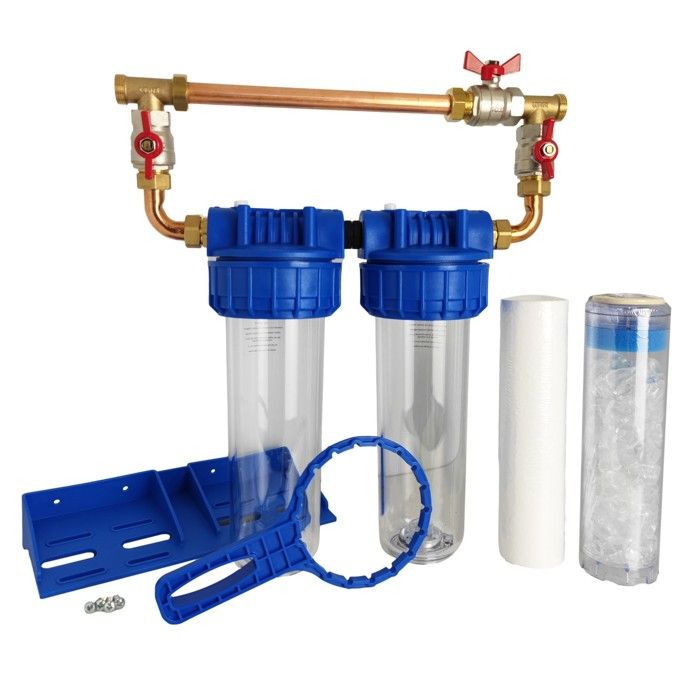 Double porte filtre à eau 93/4 - 20/27F bypass laiton + cartouche filtre sédiment 20 et Polyphosphate