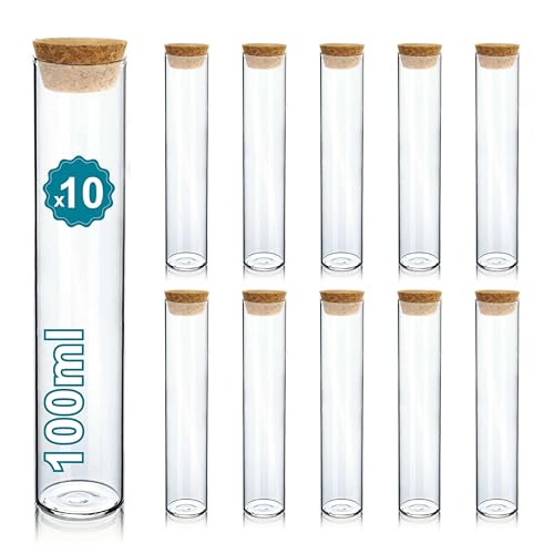 Pack 10 Tube a Essai avec Bouchon Liege 100ml- Bocaux pour Laboratoire, Bocaux Fiole en Verre- Dragees Mariage, Decoration, Bapteme- Épices, Bonbons
