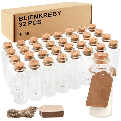 BLIENKREBY 32 x Fiole en Verre, 40ml Petite Fiole en Verre avec Bouchon, Contenant Dragées Baptême, Cadeau Mariage Fête Décoration, Mini Bocaux Bouchon avec Liège, Carte, Ficelle
