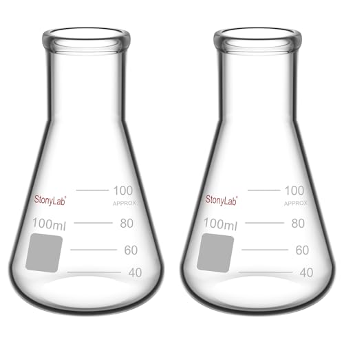 stonylab 2-Paquet Fiole Erlenmeyer en Verre à Paroi Lourde avec Bouche étroite et Bord Robuste, Narrow Mouth Erlenmeyer Flasks - (100 ml Convient au Bouchon en Caoutchouc 5#)