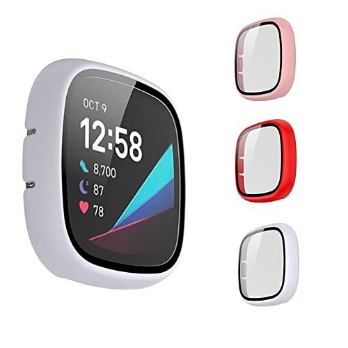 Lot de 3 coques de protection d'écran compatibles avec Fitbit Versa 3/Sense, PC + film trempé - Couverture complète de l'écran - Pour homme et femme (rose/rouge/blanc)