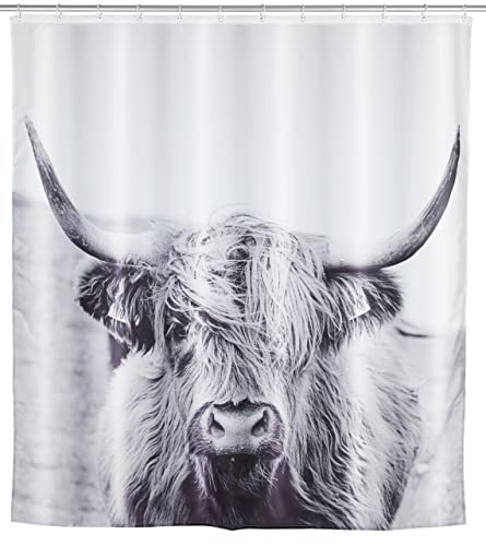 WENKO Rideau de douche Yak, rideau textile hygiénique, lavable, hydrofuge & d'entretien facile, avec 12 anneaux pour la fixation sur la barre de douche, 180 x 200 cm, blanc/noir