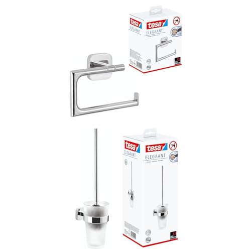 tesa ELEGAANT Support de papier toilette sans couvercle + tesa ELEGAANT Set de brosses de toilette, chromé, avec verre satiné - pour fixation murale sans percer, solution adhésive performante incluse