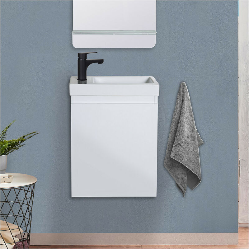 Mob-In – Meuble lave-mains suspendu 41x21,5cm avec robinet noir – Fixation murale – Vasque céramique blanche – 2 étagères de rangement