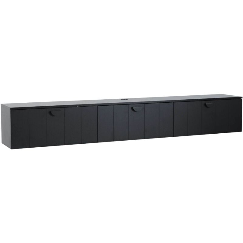 Oviala – Meuble TV suspendu 200 cm noir – MDF mélaminé – 3 orifices pour câbles – Fixation murale robuste – Style moderne et épuré