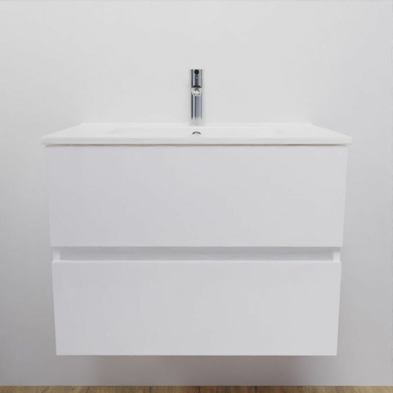 Aurlane – Meuble salle de bain suspendu 60cm – 2 tiroirs laqués blancs – Vasque céramique avec trop plein – Miroir à suspendre avec fixation