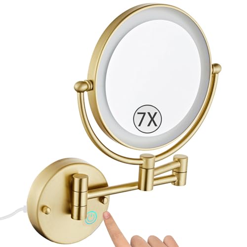 Zysfadc Miroir De Maquillage Éclairé À Fixation Murale, Miroir Grossissant LED Double Face De 8", Miroir Cosmétique Extensible À Intensité Lumineuse Réglable par Simple Pression,Brushed Gold,7X