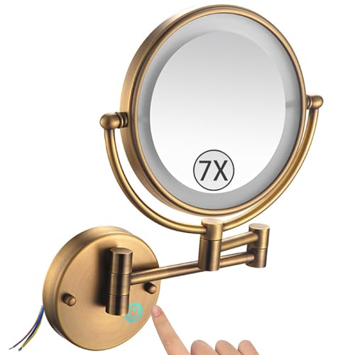 Zysfadc Miroir De Maquillage Éclairé À Fixation Murale, Miroir Grossissant LED Double Face De 8", Miroir Cosmétique Extensible À Intensité Lumineuse Réglable par Simple Pression,Laiton,7X