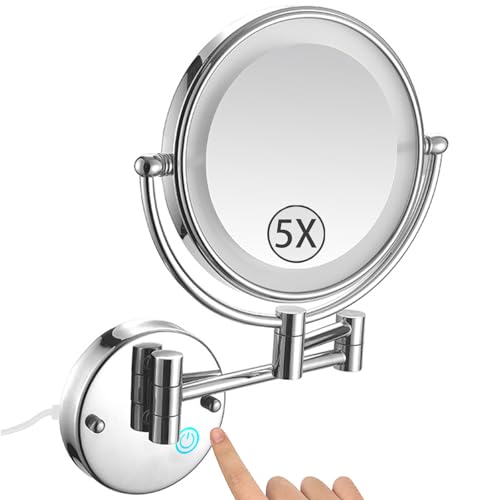 Zysfadc Miroir De Maquillage Éclairé À Fixation Murale, Miroir Grossissant LED Double Face De 8", Miroir Cosmétique Extensible À Interrupteur À Poussoir,Chrome,5X